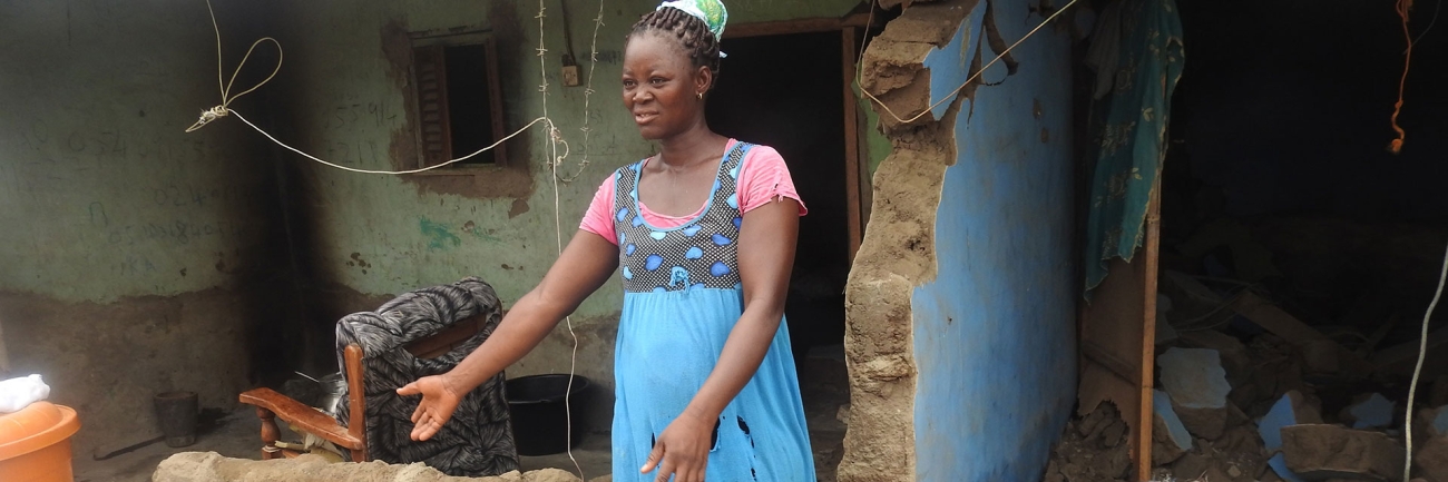 Kayampok is a widow and mother of four children from the Upper East Region of Ghana. In October 2019, torrential rains caused devastating flooding in the region. People lost their livelihoods because farms and houses were submerged in the floods and more than 26,000 people were displaced and living with relatives or in temporary shelters.
