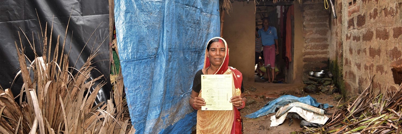 Jogendra was able to start working on a rebuilding project. He used the cash received to purchase some straw. Using straw, a polythene sheet, a ground sheet and mosquito net, he prepared a temporary room for his family. Now they are all together in their new home, protected from the weather.